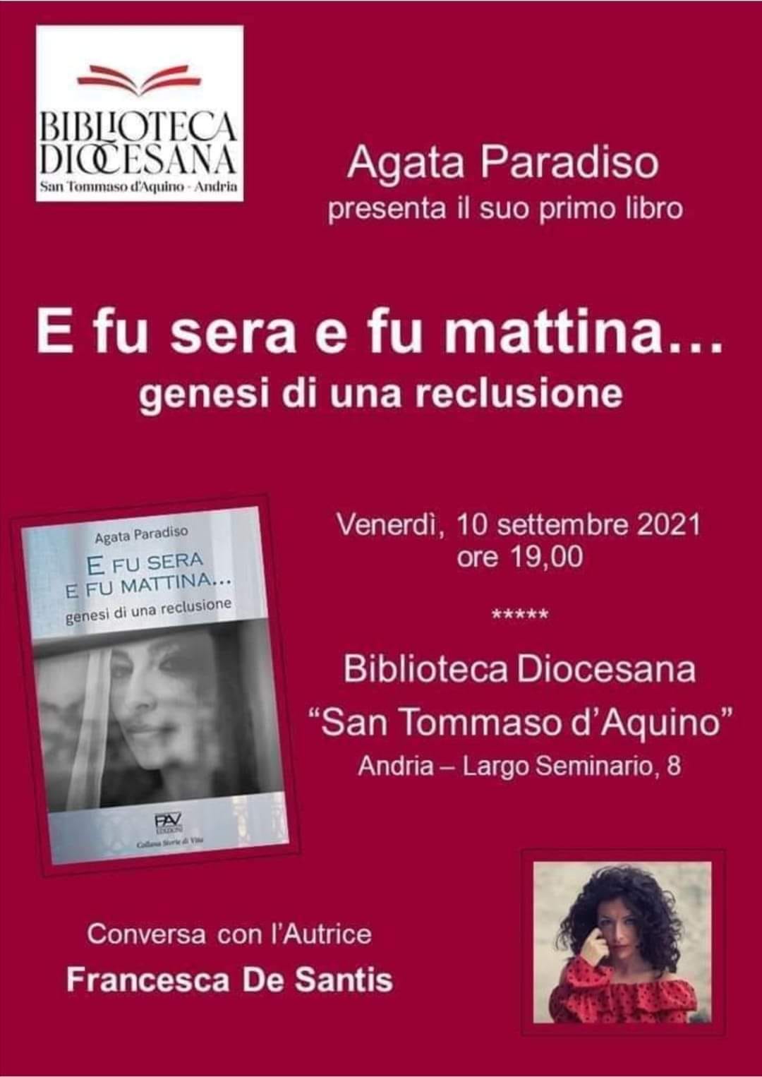 Venerdì 10 settembre, alle ore 19.00, presentazione del libro di Agata Paradiso, E fu sera e fu mattina…genesi di una reclusione. Un diario nato dai post Facebook dell’autrice durante il lockdown e divenuto occasione di riflessione e di crescita da condividere attraverso le pagine di un libro.