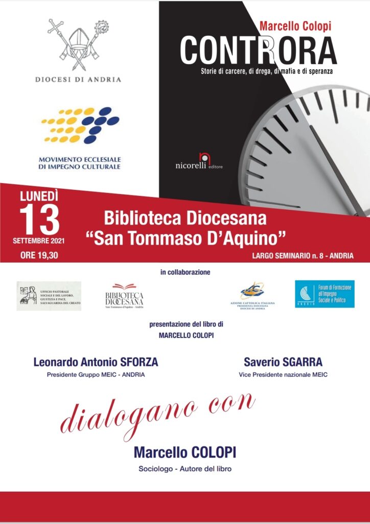 Lunedì 13 settembre Marcello Colopi dialoga con Leonardo Sforza, Presidente MAIC Andria, e Saverio Sgarra, Vicepresidente nazionale MEIC, in occasione della presentazione del suo volume Controra. Ore 19.30, presso il Chiostro del Seminario Vescovile.