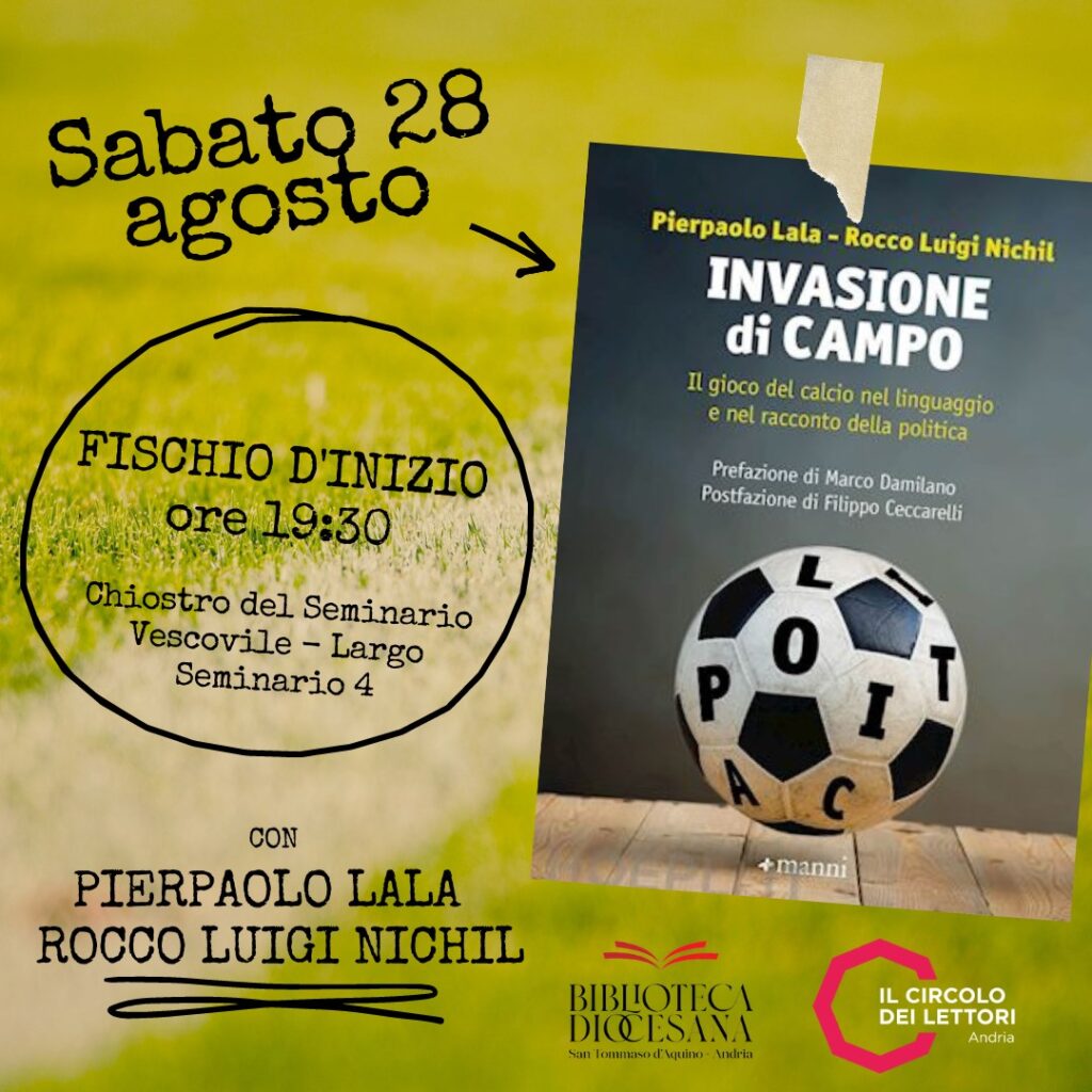 Sabato 28 agosto alle ore 19.30, insieme al circolo dei Lettori di Andria, presso il chiostro del Seminario Vescovile, incontreremo Pierpaolo Lala e Rocco Luigi Nichil per discutere insieme del loro Invasione di campo edito da Manni Editori.
