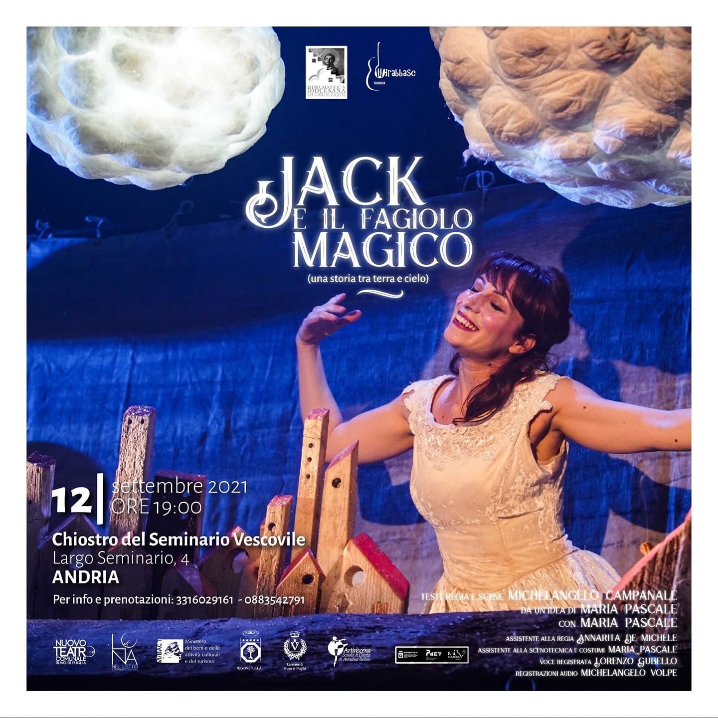 L’associazione Myrabbasc e la Biblioteca Diocesana di Andria “San Tommaso d’Aquino” propongono il bellissimo spettacolo teatrale JACK E IL FAGIOLO MAGICO (una storia tra cielo e terra), curato dalla compagnia teatrale di Ruvo “La luna nel letto” (tra il dire e il fare). Consigliato ai bambini dai 2 ai 99 anni!